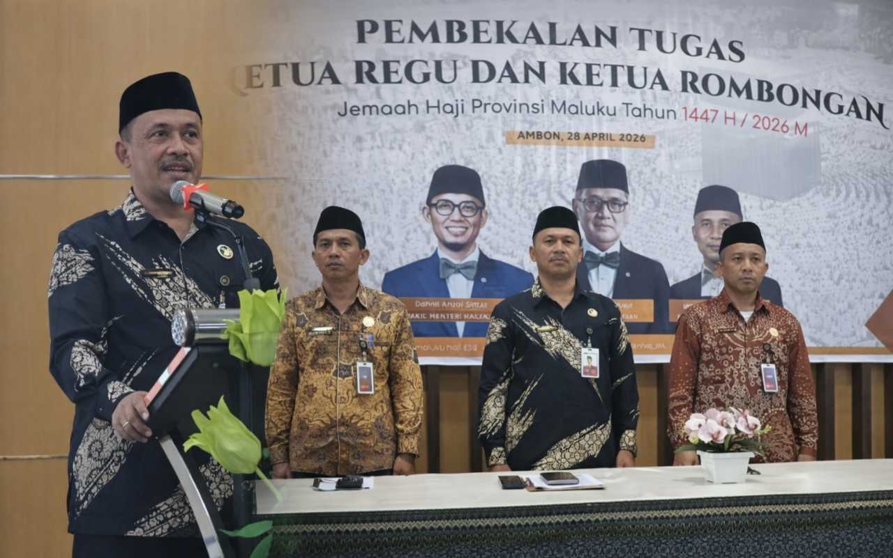 AMBON,EKSPRESSIMALUKU,- Kepala Kantor Wilayah Kementerian Haji dan Umroh Provinsi Maluku, H. Djumadi Wali, S.Ag, M.H resmi membuka kegiatan pembekalan tugas Ketua Regu (Karu) dan Ketua Rombongan (Karom) Jemaah Haji Provinsi Maluku Tahun 1447 H/2026 M di Aula Kantor Kemhaji Waiheru, Ambon, Selasa, 28/04/2026.