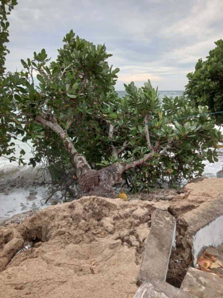 Abrasi disebut-sebut dipicu oleh aktivitas manusia, terutama pengambilan pasir secara berlebihan serta perusakan terumbu karang untuk membuka akses masuk ke pantai.